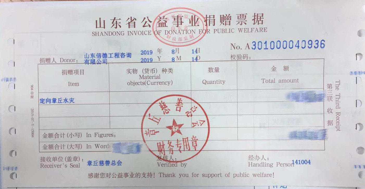 山东倍德工程咨询有限公司捐款章丘慈善总会,助力灾区救援 2019年8月,受台风“利奇马”影响,山东省济南市章丘区多处村庄遭暴雨侵袭受灾严重,牵动着无数人的心。为积极响应济南市委、市政府“一方有难,八方支援”的号召,山东倍德工程咨询有限公司及时向章丘慈善总会发出捐款,以自己的实际行动救助受灾群众,为灾区人民贡献一份力量。绵力齐聚,必将众志成城。山东倍德工程咨询有限公司愿与灾区人民携手同